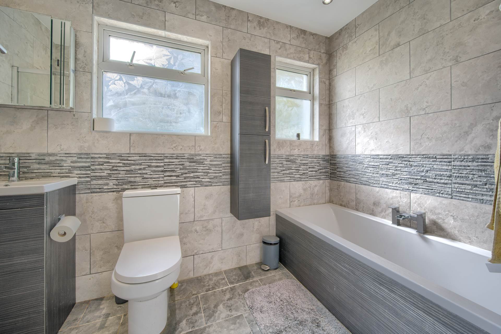 Fully tiled and fitted with a four piece suite in white comprising bath, quadrant shower, wash hand basin set on vanity unit and WC. Heated towel rail and two windows to rear.