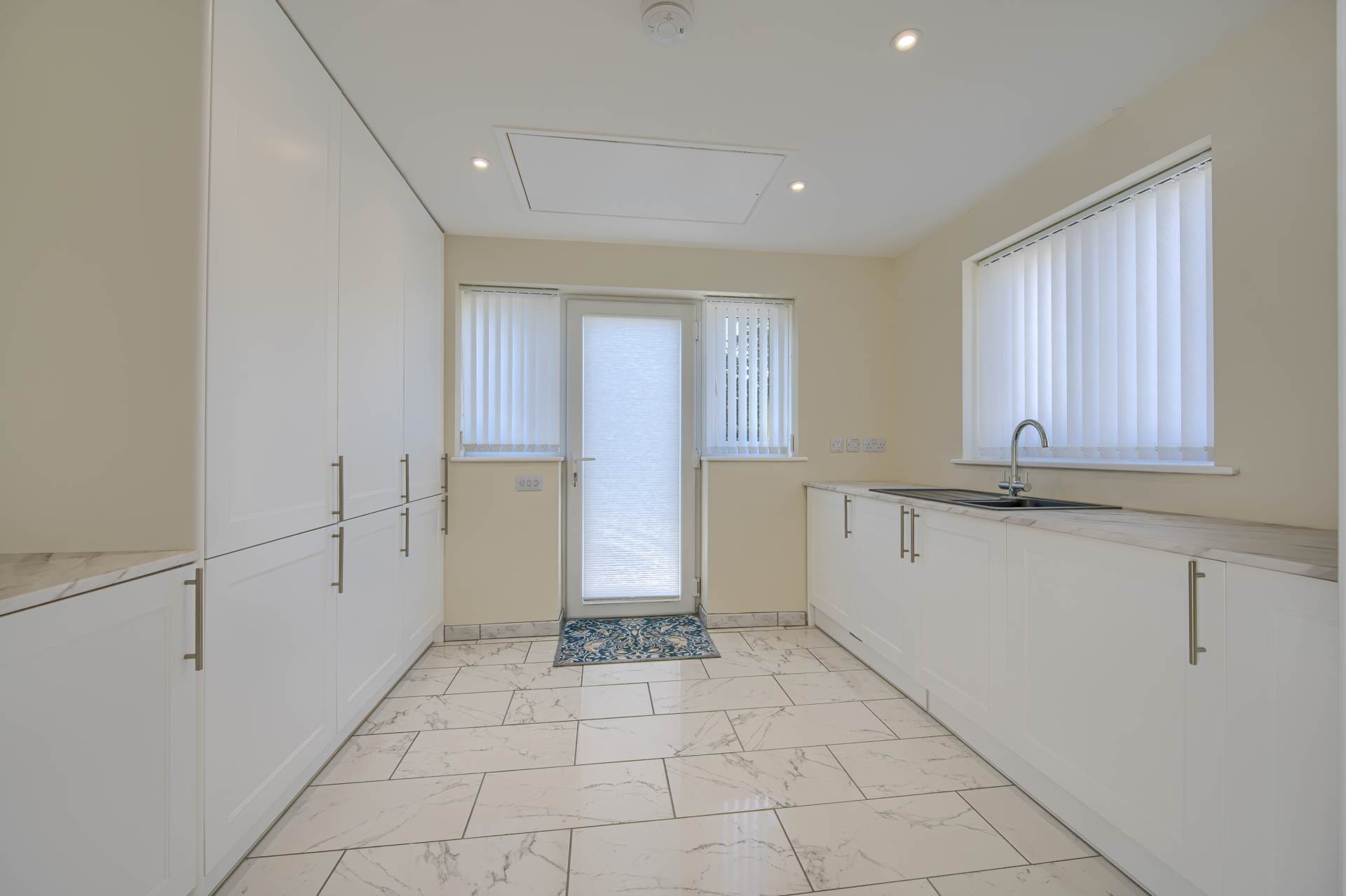 With range of fitted units providing a large amount of storage. Candy washing machine and Hoover tumble dryer, laminated worktops with sink unit. Door to side with windows either side. Pull down loft ladder providing access to roof space over. Electric boiler with cylinder and storage space.